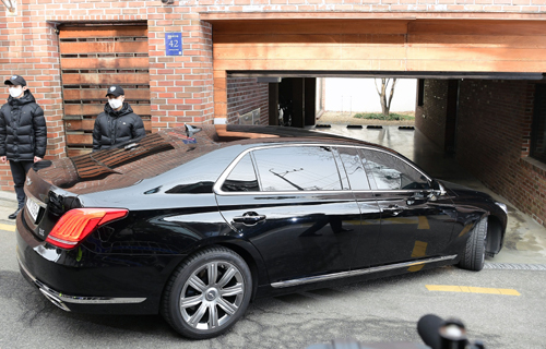 논현동 자택으로 귀가 이명박 전 대통령이 탄 검은색 제네시스가 6일 오후 4시10분쯤 서울 강남구 논현동 자택 주차장으로 들어가고 있다. 서울고법은 이날 이 전 대통령에게 조건부 보석을 허가했다.