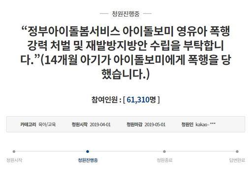 이 부부는 지난 1일 청와대 청원 게시판에 ‘정부아이돌봄서비스 아이돌보미 영유아 폭행 강력처벌 및 재발 방지 방안 수립을 부탁합니다’라는 제목의 청원글(사진)을 올렸다.
