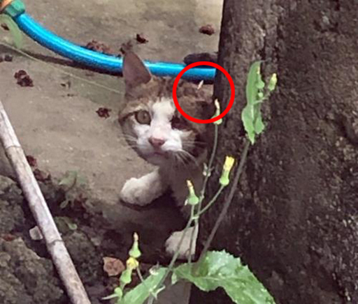 머리에 못으로 추정되는 물체가 박힌 채 거리를 배회하던 고양이 ‘모시’가 구조돼 치료를 받았다.