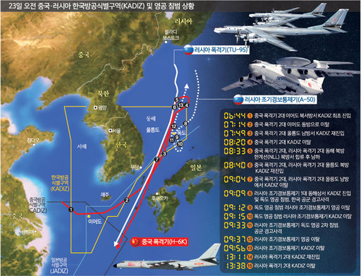 23일 중국과 러시아의 폭격기 4대의 한국방공식별구역(KADIZ) 진입과 러시아 조기경보통제기 1대의 독도 영공 침범은 일촉즉발의 분위기가 우려될 만큼 긴박하게 이뤄졌다. 중국과 러시아 군용기는 동해 상공을 자신들의 작전구역으로 생각하듯 거리낌 없이 비행했으며, 우리 공군은 이들을 저지하기 위해 경고사격을 가하는 아슬아슬한 상황이 벌어졌다.