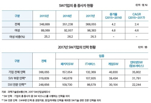 국내 SW시장을 살펴보면 2016년 120,528억원(IT서비스 80,149억원, 패키지SW 40,379억원)에서 2017년 125,485억원(IT서비스 83,545억, 패키지SW 41,940억)으로 4.1% 성장하였으며, 인력 현황을 살펴보면 2015년에서부터 2017년사이 SW기업의 종사자가 4.2% 증가하는 등 관련 업계의 일자리 수요가 점점 증가하는 추세이다.