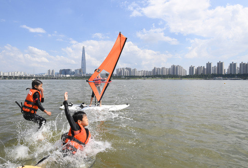 13일 오후 서울 뚝섬 한강공원에서 열리고 있는 ‘한강 몽땅축제’에서 참가 학생들이 물놀이를 하며 더위를 식히고 있다.