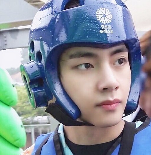 수상 레저를 즐기기 위해 구명조끼와 얼굴 보호대를 착용한 가운데 뷔는 보호대를 쓰고도 살아남는 조각같은 외모로 시작부터 시선을 끌었다.