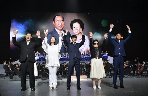 ① 세계평화통일가정연합 한학자 총재(오른쪽 두 번째), 문선진 세계회장(오른쪽 네 번째) 등이 무대에 올라 참석자들과 함께 억만세삼창을 하고 있다.
