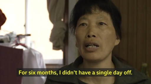 아들의 결혼식에 필요한 돈을 마련하기 위해 일본에 왔다는 중국인 여성은 한 의류 회사에서 꼼데가르송, 바니스뉴욕 등 유명 브랜드의 옷에 라벨을 붙이는 일을 해왔다. 이 여성은 BBC에 “처음 도착했을 때 아침 6시30분부터 자정까지 6개월동안 하루도 쉬지 않고 일했다. 하지만 회사의 급료명세서는 다 가짜였다. 초과근무는 전혀 돈을 받지 못했다”고 말했다. 이어 “너무 지쳐서 다리가 부어오르고 허리를 다쳤다. 항상 머리가 아파 밤에 울었다. 만약 내 상태가 좋지 않다는 것을 사장이 알게되면 나를 해고할까봐 사장에게 말하기도 두려웠다”고 말했다. BBC는 이 여성이 2017년 10월부터 2018년 9월까지 매일 근무시간을 적어놓은 메모를 보여줬으며, 5만달러 가까이 빚도 지게 됐다고 말했다고 전했다. BBC는 그러나 이 회사측은 모든 직원이 다 최저임금에 기초해 계산된 기본급을 받고 있으며 고용 관련 법을 다 지키고 있다는 입장을 밝혀왔다고도 덧붙였다. BBC캡처