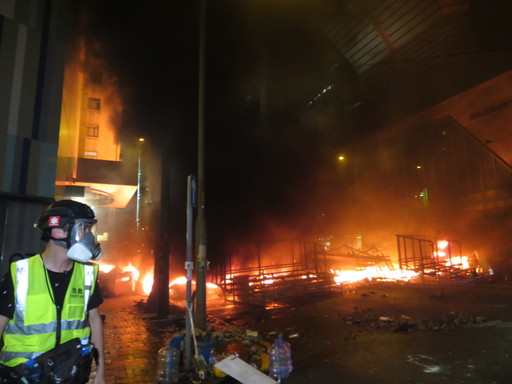◆시위대, 완차이역 앞 최후 방어선 구축……. 도로에 불 질러 경찰 진입 방어