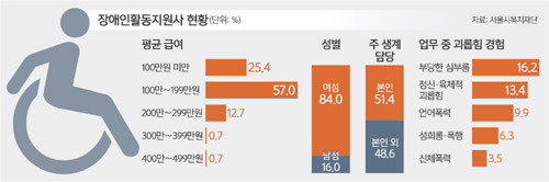 중증 장애인의 생활을 돕는 장애인활동지원사 10명 중 5명은 집안 생계를 책임지고 있으나 월수입은 대부분 200만원 미만인 것으로 나타났다. 이들은 낮은 급여와 고용 불안, 부당한 심부름 등 열악한 처우에 시달리고 있었다.