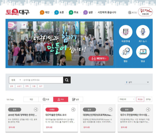 시에서 현안이나 주요 정책의제를 ‘시민에게 묻습니다’란 토론마당에 올리면 시민은 자유롭게 댓글로 의견을 제시하고, 담당 부서는 수렴한 의견을 정책으로 활용한다. 앞으로 오프라인에서 활발히 이뤄지는 토론의제 역시 ‘토크 대구’ 온라인 공간으로 연계해 시민 의견을 폭넓게 수렴할 계획이다.