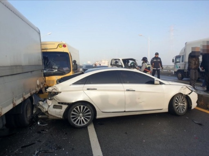 4일 오전 경기 평택시 포승읍 흥원리 장안대교에서 10중 추돌사고가 발생해 차량이 파손돼 있다. 뉴스1