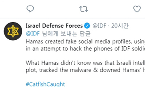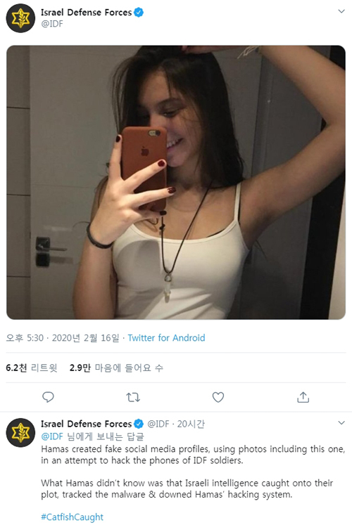 팔레스타인 무장정파 하마스가 ‘캣피싱’(catfishing: 연인을 구하기 위한 온라인상 사칭 행위)을 통해 이스라엘방위군 수십명의 휴대전화를 해킹한 것으로 드러났다.