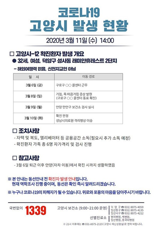 한편 이번 확진자로 고양시 코로나19 환자는 모두 12명으로 늘었다.