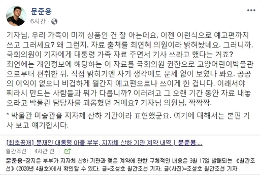 이날 문씨는 자신의 페이스북에 ‘[최초공개] 문재인 대통령 아들 부부, 지자체 산하 기관 계약 내역’이라는 제목의 월간조선 기사를 링크한 뒤 “기자님, 우리 가족이 ‘미끼 상품’인 건 잘 아는데 이젠 이런식으로 예고편까지 쓰고 그러느냐”고 따져 물었다.