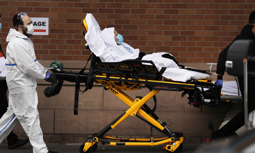 지난 5일(현지시간) 뉴욕 브루클린 버러파크 인근 마이모니데스 메디컬센터의 의료진들이 코로나19환자를 이송하고 있다. 뉴욕=AFP연합뉴스