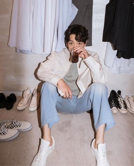 공개된 사진 속 그는 의류와 신발이 놓여 있는 공간에 앉아 음료를 마시고 있다.