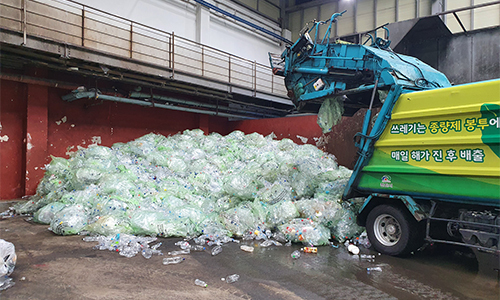 지난 15일 찾아간 충남 천안시 서북구의 재활용선별장에서는 공동주택과 단독주택에서 분리 배출돼 수집된 폐페트병들이 암롤차에서 쏟아져 나오고 있었다. 천안시는 시범사업이 성공적으로 실시되고 있는 곳으로 현재까지 50t 정도의 플레이크가 생산됐다. 천안시는 환경부 등과 업무협약을 맺고 이 플레이크를 활용해 신발, 가방, 플라스틱 용기 등으로 제품을 본격적으로 출시할 계획이다.
