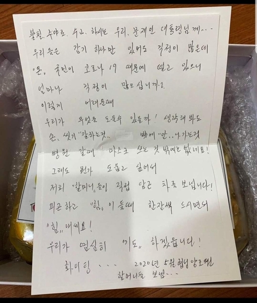 그러면서 "할머니들은 코로나 극복을 위해 애쓰는 국민들께 보탬이 되고 싶은 마음에 보내주신 것"이라며 "코로나 재확산이 염려되는 상황이고 수도권 여기저기서 확진자가 발생해 긴장되지만, 할머니들처럼 조심하는 마음이 있다면 이 고비도 충분히 이겨낼 것"이라고 말했다.