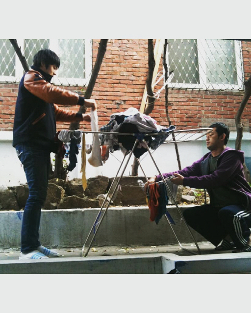 공개된 사진에는 그가 만화가 이말년(본명 이병건)과 함께 집 밖에 건조대를 놓고 빨래를 널고 있는 모습이 담겼다.