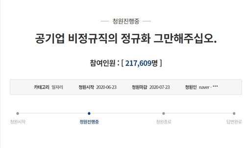 25일 청와대 국민청원 게시판의 ‘진행 중 청원’에는 ‘공기업 비정규직의 정규(직)화 그만해주십(시)오’라는 제목의 청원이 전체 추천순 1위에 올라있다. 지난 23일 올라온 이 청원은 이날 오전 5시45분 현재 21만7600여명이 참여해 청와대로부터 답변을 끌어낼 수 있는 기준인 20만명을 이미 넘겼다. 청원 마감일은 내달 23일이다.