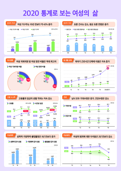 여성가족부와 통계청은 2일 이런 내용의 '2020 통계로 보는 여성의 삶'을 발표했다.