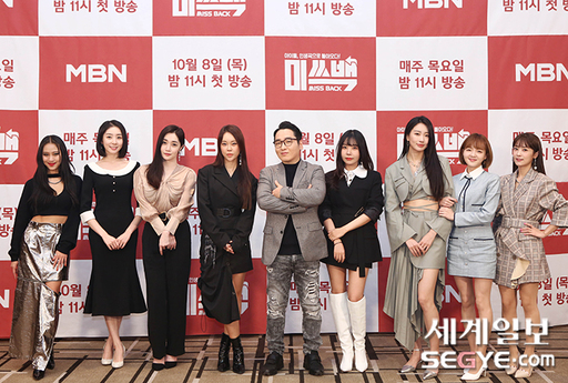 가수 나다, 가영, 세라, 백지영, 윤일상, 레이나, 수빈, 유진, 소율(사진 왼쪽부터)이 8일 오후 열린 MBN 예능 '미쓰백' 온라인 제작발표회에 참석해 포즈를 취하고 있다.