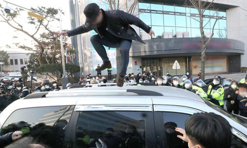 경찰에 따르면 A씨는 조씨의 출소를 반대하는 집회에서 이런 행위를 했다. A씨의 과격 행위로 파손된 법무부 호송차의 수리 견적금액은 899만원가량인 것으로 알려졌다.