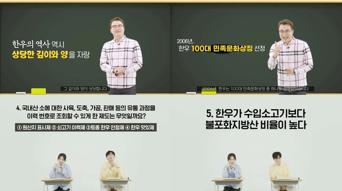 ‘큰별쌤’ 최태성 한국사 강사의 ‘우리 한우의 역사’편에서는 우리나라 역사 속 한우의 의미에 대해 알아보는 다양한 역사와 정보를 알기 쉽게 전달하고 있다. 또한 ‘한우 탐구영역 시험!’편에서는 일반인 출연자들이 등장해 간단한 퀴즈를 풀면서 한우에 대한 오해를 해소하고 올바른 정보를 얻어가는 내용을 담고 있다.