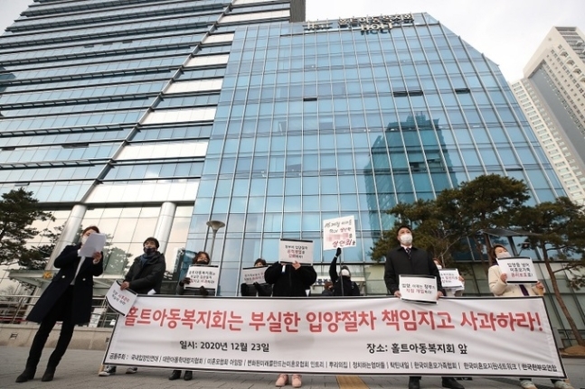 국내입양인연대 등이 지난달 23일 오후 서울 마포구 홀트아동복지회 앞에서 부실한 입양절차를 책임지고 사과하라는 집회를 하고 있다. 연합뉴스
