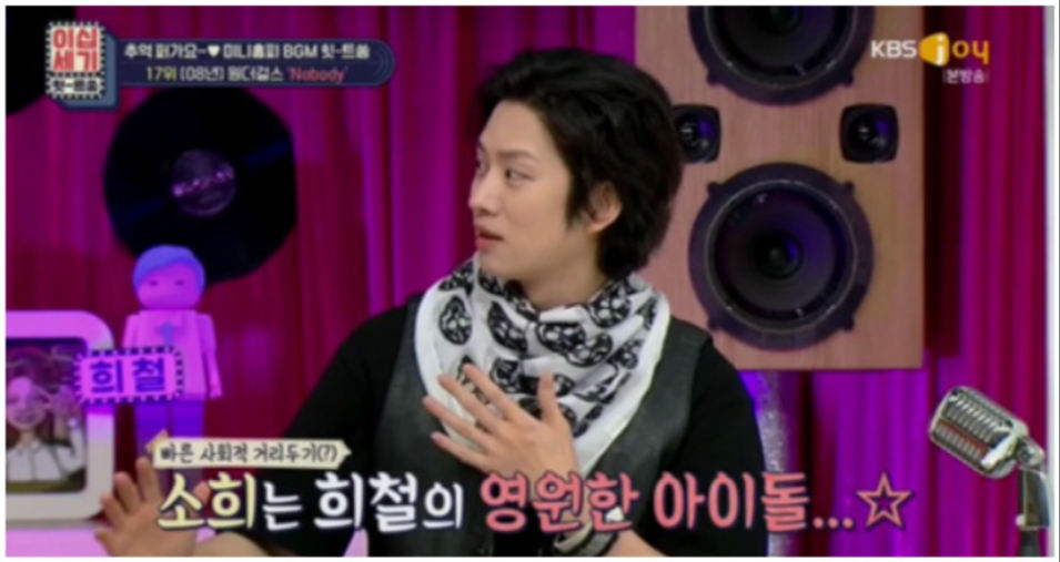 이에 김희철은 공감하며 “그때 내가 에픽하이 미쓰라진이랑 친구였는데 미쓰라진은 소녀시대 팬, 난 원더걸스 팬이었다”고 밝혔다.