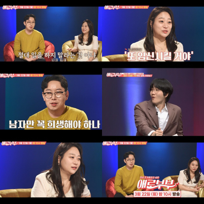 22일 방송되는 ‘애로부부’에서는 6, 5, 3세 삼남매를 둔 김현기&김경미 부부가 ‘속터뷰’에 출격한다. 30대 후반에 모바일 쇼호스트로 데뷔해 꿈꾸던 일을 시작한 아내는 넷째가 또 생겨 일에 지장이 생길까 봐 불안해하고 있었지만, 남편 쪽에서는 아내가 권하는 정관수술을 거부 중이었다.