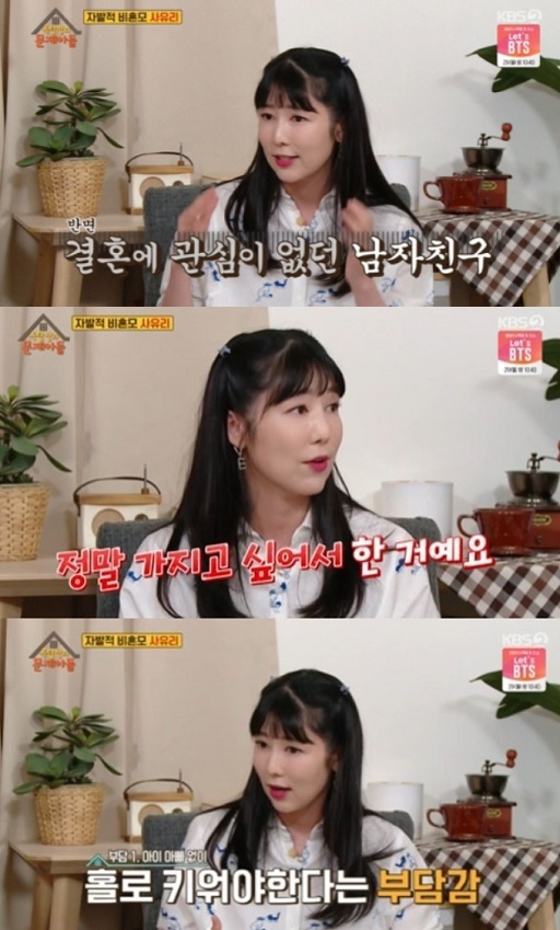 지난 23일 방송된 KBS2 예능프로그램 ‘옥탑방의 문제아들’에서는 사유리가 출연해 자발적 비혼 출산을 하게 된 이유를 밝혔다.
