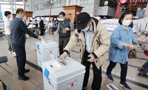 4·7 재·보궐선거 사전투표 첫날인 2일 서울역에 설치된 남영동 사전투표소에서 시민들이 투표함에 투표용지를 넣고 있다.