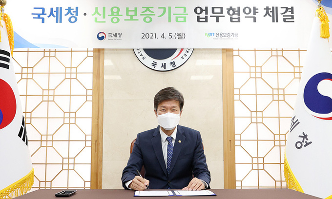 김대지 국세청장이 5일 세종시 청사 집무실에서 국세청과 신용보증기금의 업무협약(MOU) 서류에 서명하고 있다. 이번 협약에 따라 모범납세자가 신용보증기금의 신용보증을 이용하면 신용보증 수수료율을 0.2%포인트 할인받고, 보증비율을 최대 90%까지 적용받을 수 있다.