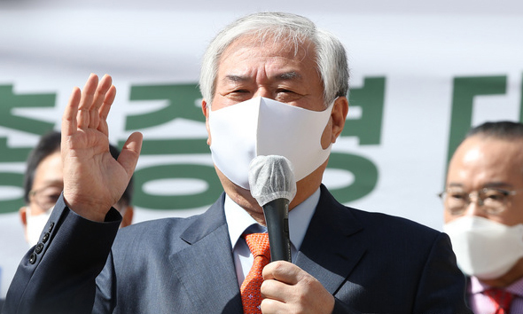 전광훈 사랑제일교회 목사는 5일 오전 사랑제일교회 앞에서 기자회견을 열고 “서울시와 성북구청, 재개발 조합 측, 이 세 기관이 연대하여 사랑제일교회를 해체하려고 시대적 사기극을 펼쳤다”고 주장했다.