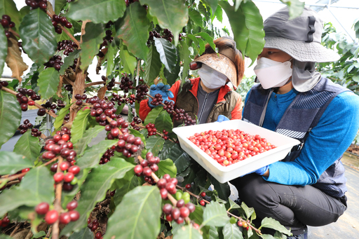 8일 제주시 오등동 국립원예특작과학원 온난화대응농업연구소에서 관계자들이 시험 시설 재배 중인 커피 열매를 수확하고 있다.