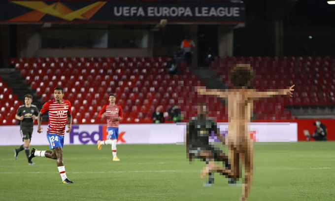 9일 스페인 그라나다의 에스타디오 무니시팔 누에보 로스 카르메네스에서 열린 잉글랜드 프로축구 맨체스터 유나이티드(맨유)와 그라나다(스페인)와 2020-2021시즌 UEFA 유로파리그 8강 1차전 원정경기. 신종 코로나 바이러스 감염증(코로나19) 확산 여파로 경기는 무관중으로 펼쳐졌다. 양팀이 밀고 밀리는 치열한 공방전을 펼치던 경기 전반 초반 갑자기 한 남성이 발가벗은 채로 그라운드에 난입해 뛰어다니는 황당한 상황이 벌어졌다. 이에 경기가 잠시 중단되는 소동이 벌어졌고 남성은 경찰에 끌려 나갔다.