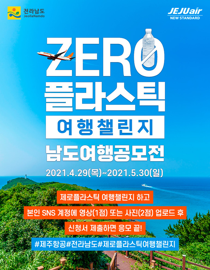 제주항공은 무안~제주노선 재운항을 기념해 전남도와 함께 ‘제로플라스틱 여행챌린지, 남도여행공모전’을 개최한다고 29일 밝혔다. 지난해에 이어 두번째로 진행되는 이번 공모전으로 지역 관광 활성화와 환경보존을 위한 취지로 마련됐다.