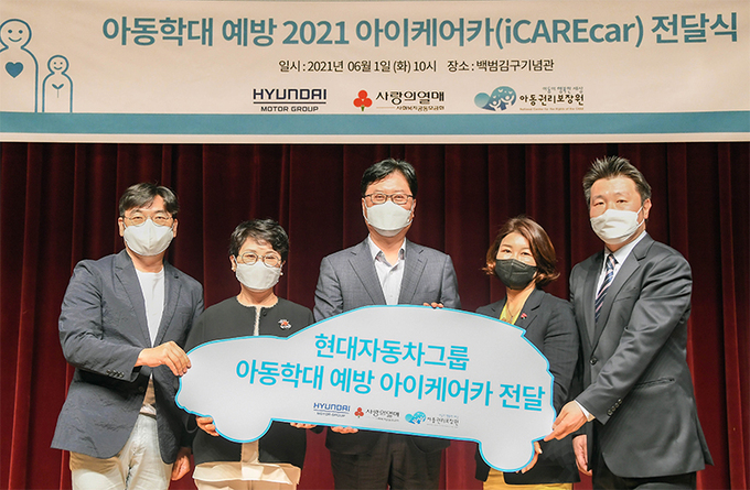 이용우 영등포아동보호전문기관 관장과 윤혜미 아동권리보장원 원장, 이병훈 현대차그룹 상무, 김경희 사회복지공동모금회 본부장, 채성용 서울동부아동보호전문기관 관장(왼쪽부터)이 1일 서울 용산구 백범김구기념관에서 아동학대 예방 및 근절을 위한 ‘2021 아이케어카(iCAREcar) 전달식’을 한 뒤 기념촬영하고 있다.