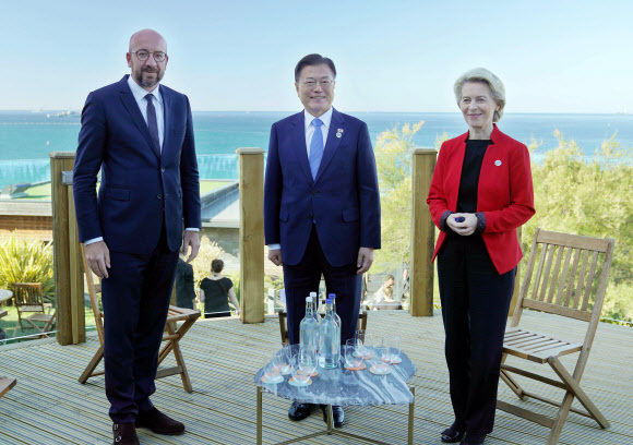 서방 주요7개국(G7) 정상회의 참석자 영국 콘월을 방문중인 문재인 대통령은 12일(현지시간), 샤를 미셸(Charles Michel) EU 정상회의 상임의장 및 우르술라 폰 데어 라이엔(Ursula von der Leyen) 집행위원장과 정상회담을 가졌다. 문 대통령과 EU 정상들은 코로나19 대응·기후변화 등 글로벌 현안 및 한-EU 전략적 동반자 관계 발전 방향 등에 대해 의견을 교환했다.