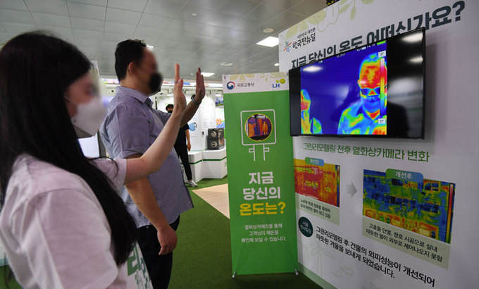 5일 서울 중구 서울역에 마련된 ‘그린리모델링 팝업하우스’에서 시민들이 그린리모델링 전·후 열화상 카메라 변화를 살펴보고 있다. 그린리모델링 팝업하우스는 건물 에너지 성능을 향상하고 쾌적한 실내환경을 조성하는 그린리모델링 효과에 대한 대국민 인지도와 이해도를 높이기 위해 국토교통부와 한국토지주택공사(LH)가 마련한 홍보공간이다.