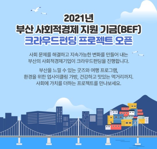 이번 프로젝트는 코로나19의 장기화로 어려움을 겪는 부산 지역 사회적경제기업 등의 판로개척과 매출확대 등을 지원하기 위해 마련됐다. 크라우드 펀딩은 사회적경제기업 등이 판매 목표금액과 참여 목표인원을 달성하면 BEF에서 매칭투자 자금을 지원하는 방식으로 진행된다.