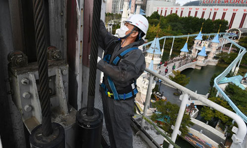 롯데월드 어드벤처에는 어트랙션 기술팀 직원이 90여 명 있다. 이들이 50여 가지 놀이기구 정비와 유지보수, 안전점검 및 정기검사 등의 업무를 맡고 있다. 오전 시간에는 점검을 하고, 오후 시간에는 탑승물 수리 및 시설 보수 작업을 한다. 야외 매직 아일랜드 70m 높이의 놀이기구 자이로드롭에서 만난 어트랙션 기술팀 김민규(52)씨가 탑승물을 끌어올리는 장치인 호이스트(Hoist) 유니트에 올라타 와이어로프 안전검사를 진행하고 있었다. 높은 곳에서 작업을 하는 모습이 아찔해 보였다.