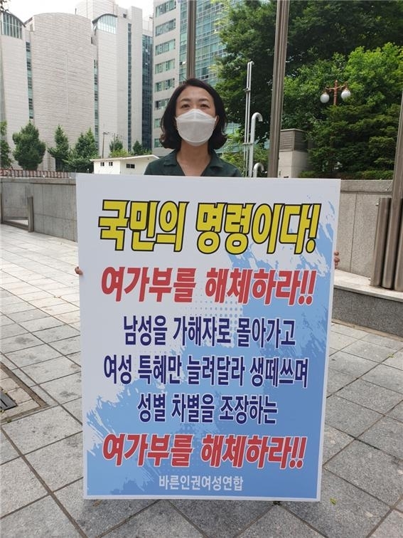 지난해 7월 바른인권여성연합 전혜성 사무총장이 여성가족부 앞에서 여가부 해체를 요구하는 피켓을 들고 시위하는 모습. 바른인권여성연합 제공