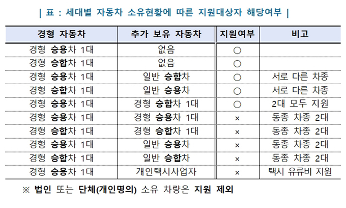 환급은 경차 소유자와 주민등록표상 동거가족이 배기량 1000㏄ 미만의 경형 승용차나 경형 승합차를 각 1대 이내로 소유한 경우에만 가능하다. 레이, 모닝, 스파크, 다마스 등이 대상 차량이다. 경형 승용차나 경형 승합차 1대와 일반 승용·승합차 1대가 있는 경우, 경형 승용차와 경형 승합차가 각각 1대씩 있는 경우는 환급을 받을 수 있다. 그렇지만 경형 승용차 1대와 일반 승용차 1대 이상을 갖고 있으면 대상이 아니다. 경형 승용차 2대가 있는 경우, 경형 승합차 2대가 있는 경우도 환급 대상이 아니다. 유가보조금 수혜대상자인 장애인, 국가유공자도 경차 유류세 환급을 받을 수 없다.