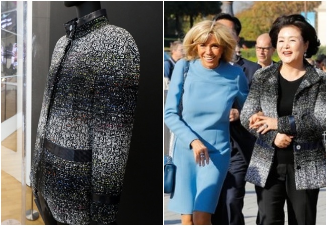 김 여사가 2018년 10월 프랑스 순방 당시 입었던 한글 재킷은 샤넬의 수석 디자이너 칼 라거펠트가 한글을 수놓은 원단을 이용해 직접 제작했다.