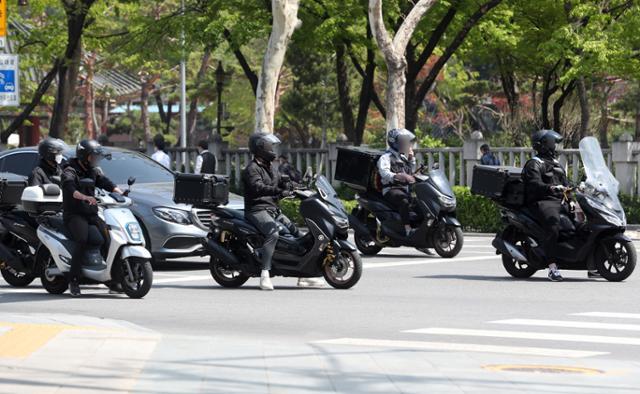 20일 오토바이를 탄 배달원들이 신호 대기를 하고 있다. 뉴시스