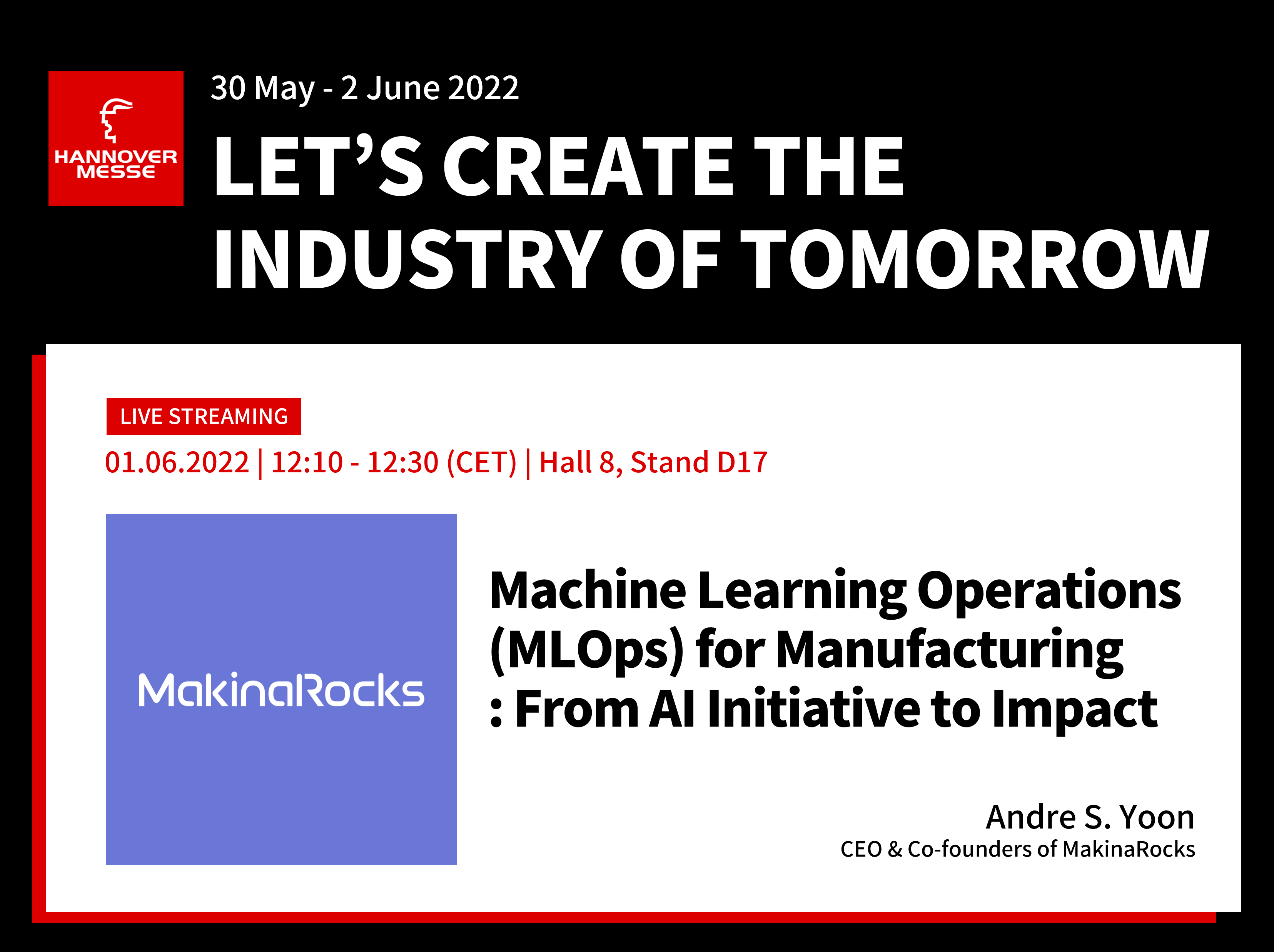 마키나락스는 올해 인더스트리 4.0 컨퍼런스 스테이지에 참가해 ‘제조 및 산업을 위한 MLOps : AI의 도입부터 적용까지’’를 주제로 발표에 나선다. 마키나락스의 세션은 6월1일 오후 12시 10분(현지시간, KST 6/1 오후 7시10분) 8번 홀에서 진행된다.