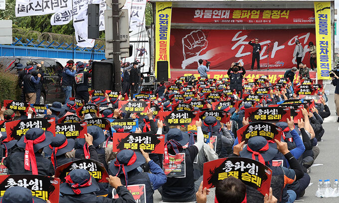 전국민주노동조합총연맹 산하 공공운수노조 화물연대본부(화물연대)가 7일 각계각층의 ‘물류 대란’ 우려에도 무기한 집단 운송거부를 밀어붙이며 물류난이 현실화하고 있다. 총파업 첫날 전체 조합원의 3분의 1가량이 전국 각지에서 열린 집회에 참석한 것으로 나타났다. 윤석열 대통령은 이날 취임 후 첫 대규모 파업인 화물연대 총파업에 대해 엄정 대응 방침을 재확인했다. 당국의 대응이 향후 5년간 노정관계의 가늠자 역할을 할 것이라는 전망이 나온다.