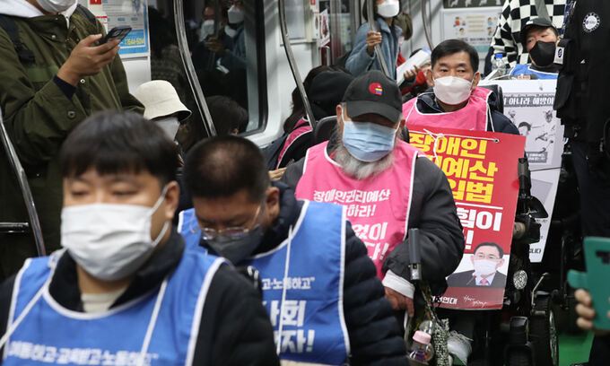 전장연은 당초 국민의힘 당사에서 마무리 집회를 할 예정이었지만 박 대표가 김성환 더불어민주당 정책위의장과 오전 국회의원회관에서 만나 내년도 예산안 관련 협의를 하는 일정이 잡히자 국회의사당역에서 집회를 종료했다. 승하차 시위도 교대역과 서초역에서만 이뤄졌다.