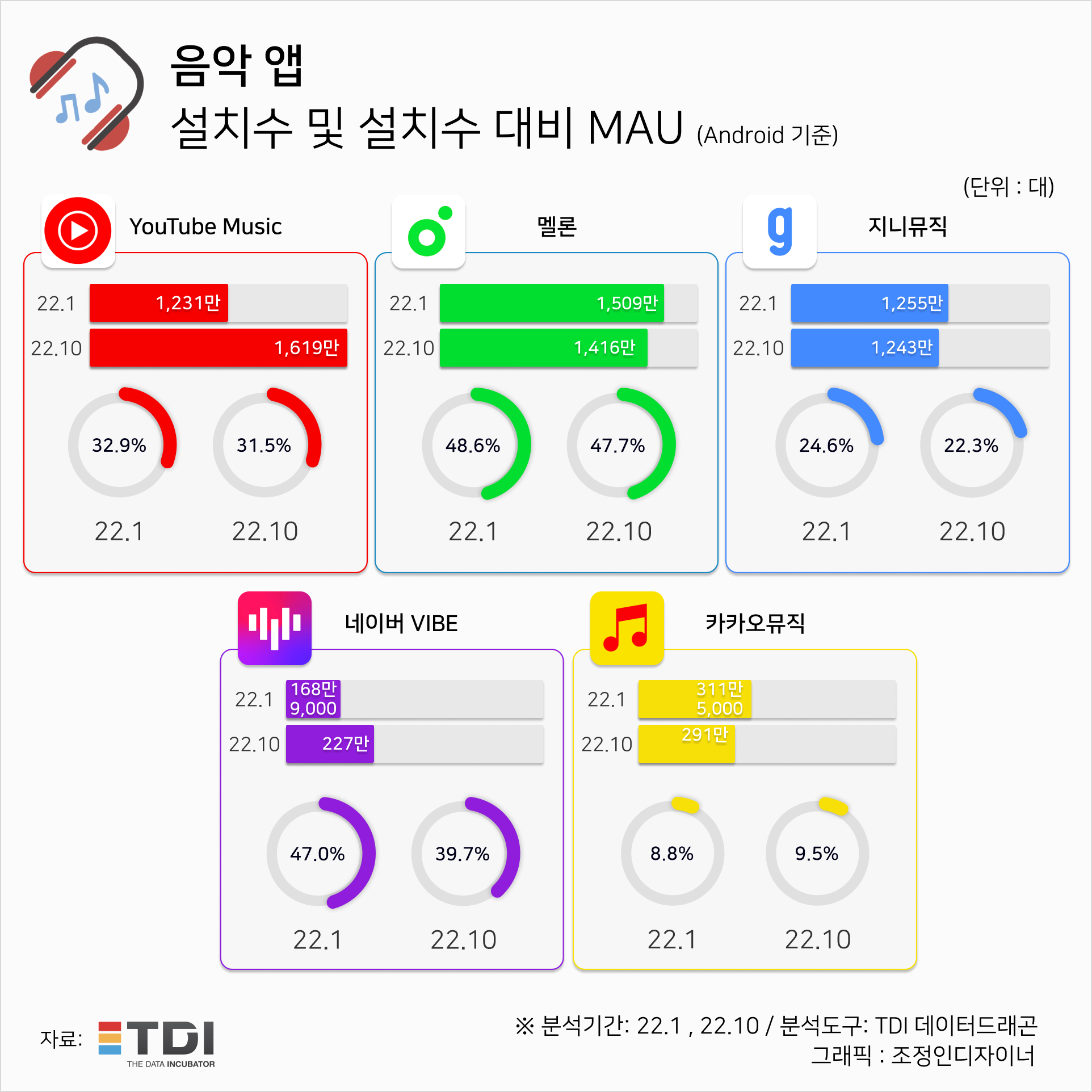 설치수 대비 MAU는 ▲멜론 48.6% → 47.7% ▲네이버 VIBE 47% → 39.7% ▲YouTube Music 32.9% → 31.5% ▲지니뮤직 24.6% → 22.3% ▲카카오뮤직 8.8% → 9.5% 등 전반적으로 감소 추세를 보였다.
