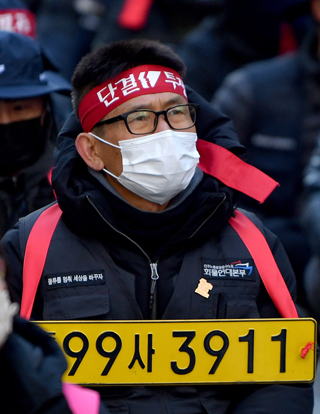 화물연대 총파업 13일째인 6일 오후 광주 서구 치평동 국민의힘 광주시당 앞에서 민주노총 광주 노조원들이 안전운임제 확대를 촉구하는 결의대회를 열고있다. 광주=뉴시스